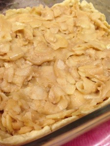 Tenemos la masa cocida, tibia. Le agregamos por encima la manzana, descartando el líquido para no mojar la masa. Luego la miga por encima y llevamos al horno hasta que la miga está dorada y crujiente.