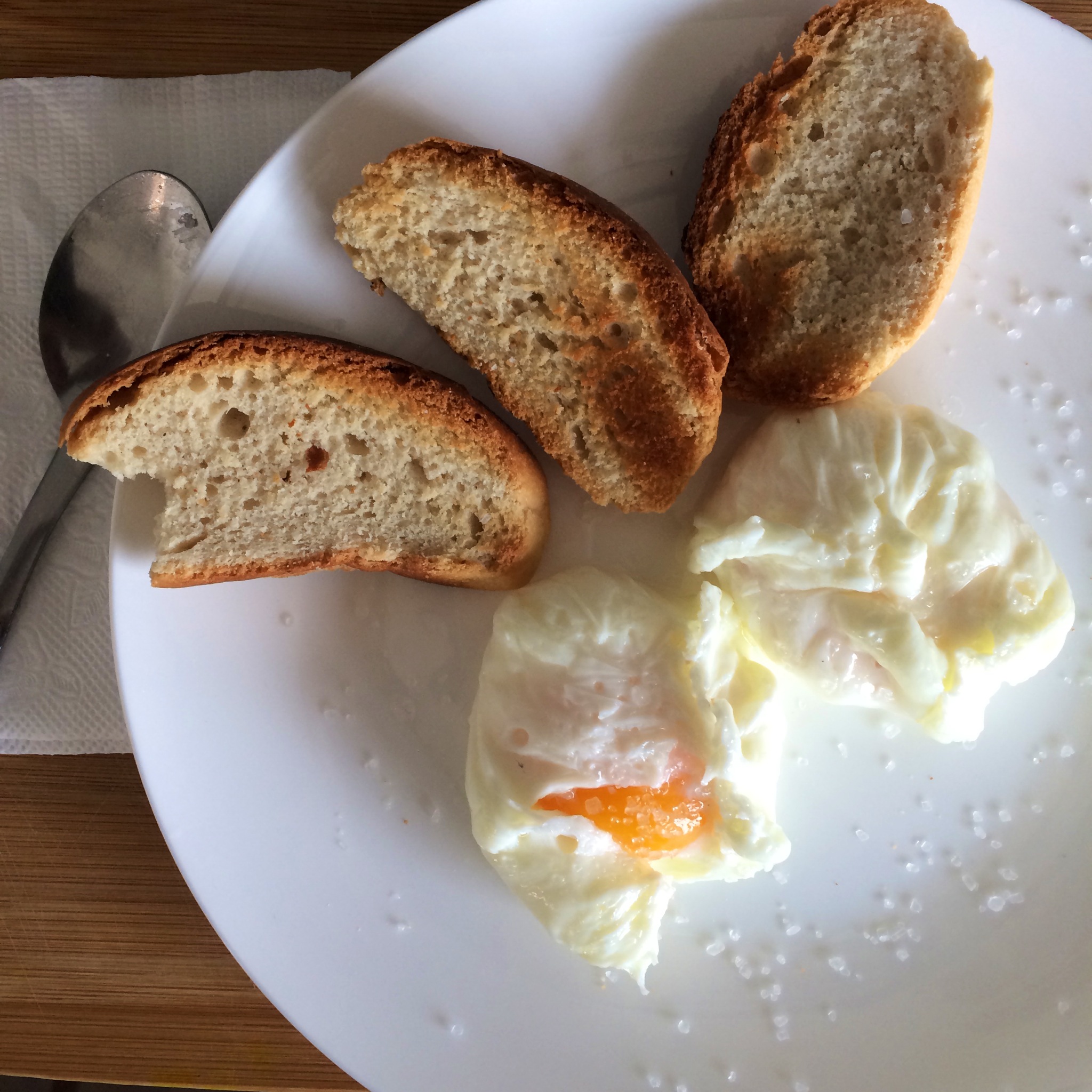 3. En 5 minutos los huevos están listos, vayan dándolos vuelta con una cuchara para que la clara quede cocida alrededor de la yema. Tienen que quedar así: