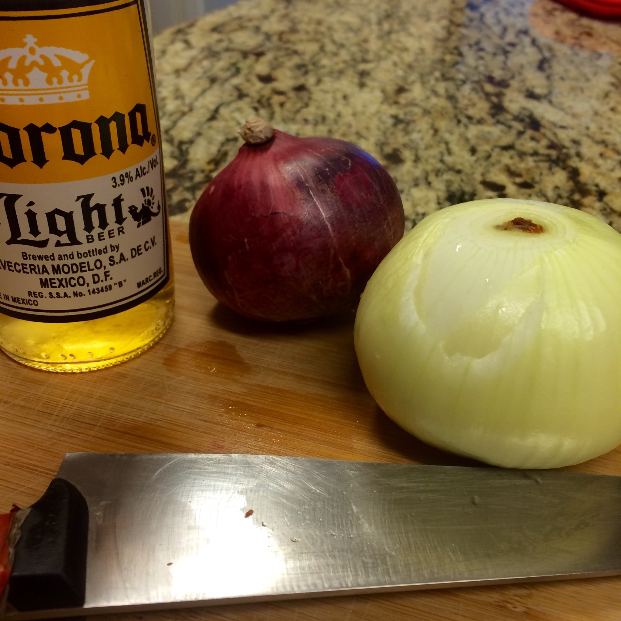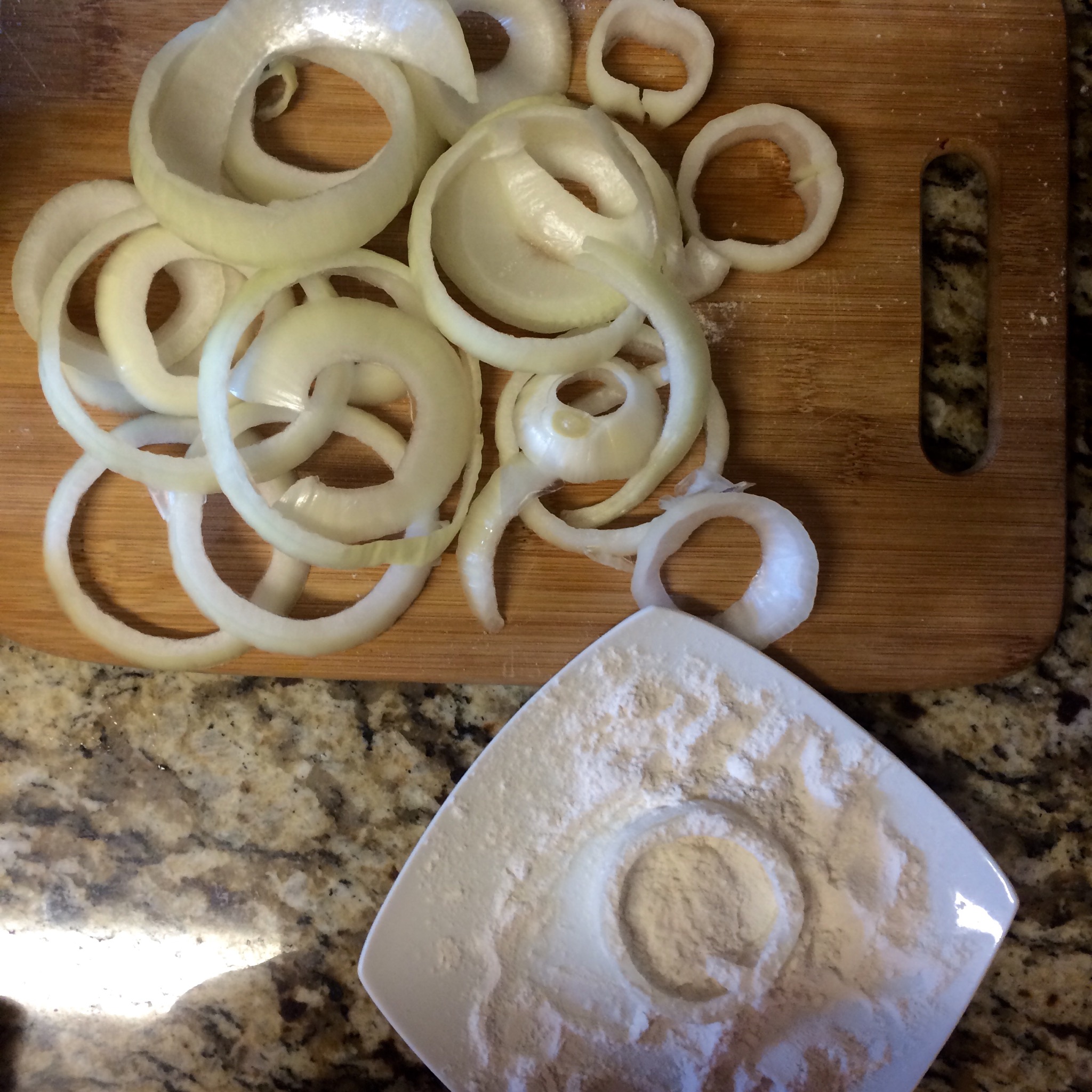 4. Pelamos la cebolla y cortamos en círculos gruesos. Para separar vamos a tirar los aritos del centro y nos vamos a quedar con los mas grandes.