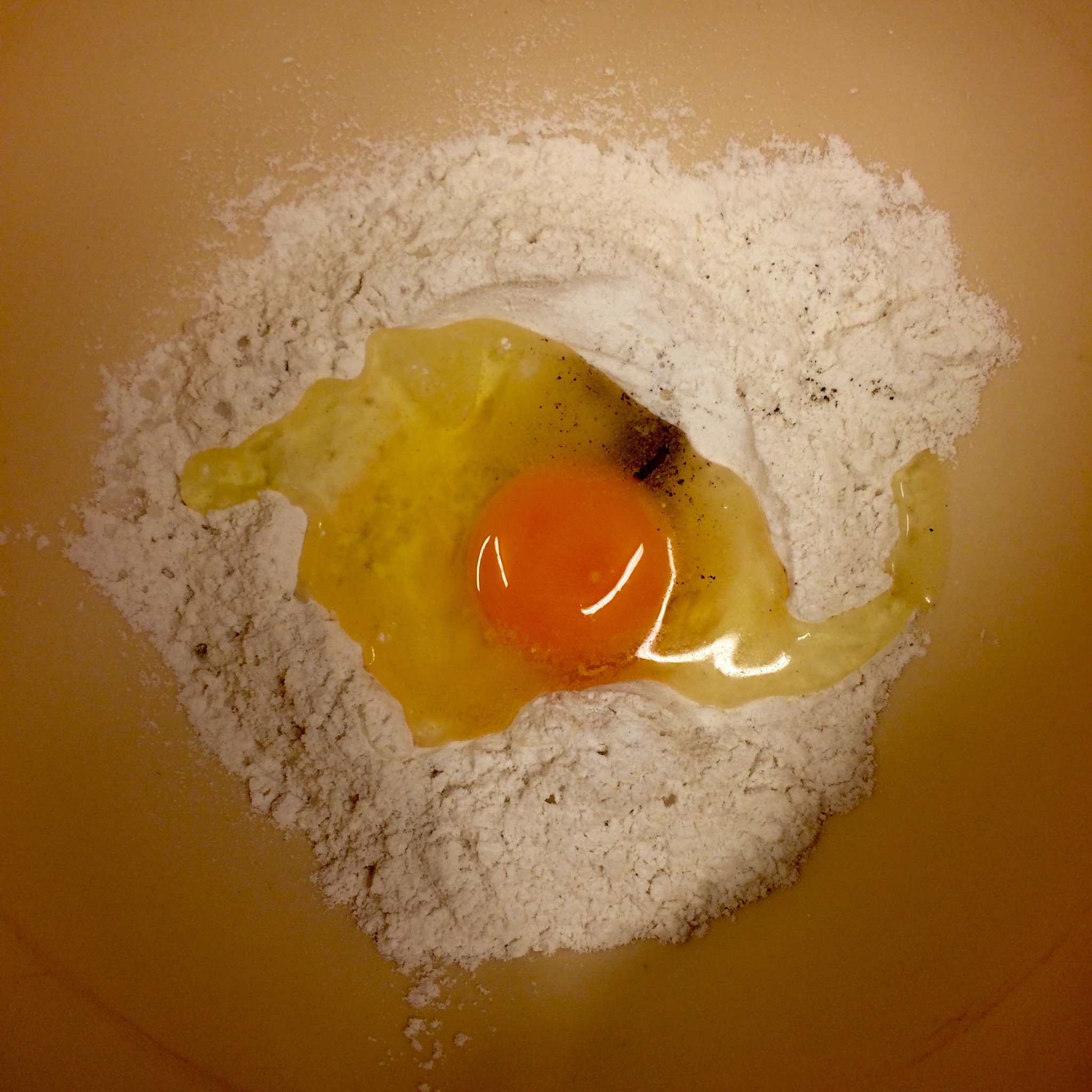 1. Mezclamos 1 taza de harina con el huevo, los polvos de hornear y la cerveza. Revolvemos con un tenedor para unir. Tiene que quedar una masa un poco grumosa, que se pegue, mas densa que la de un panqueque.