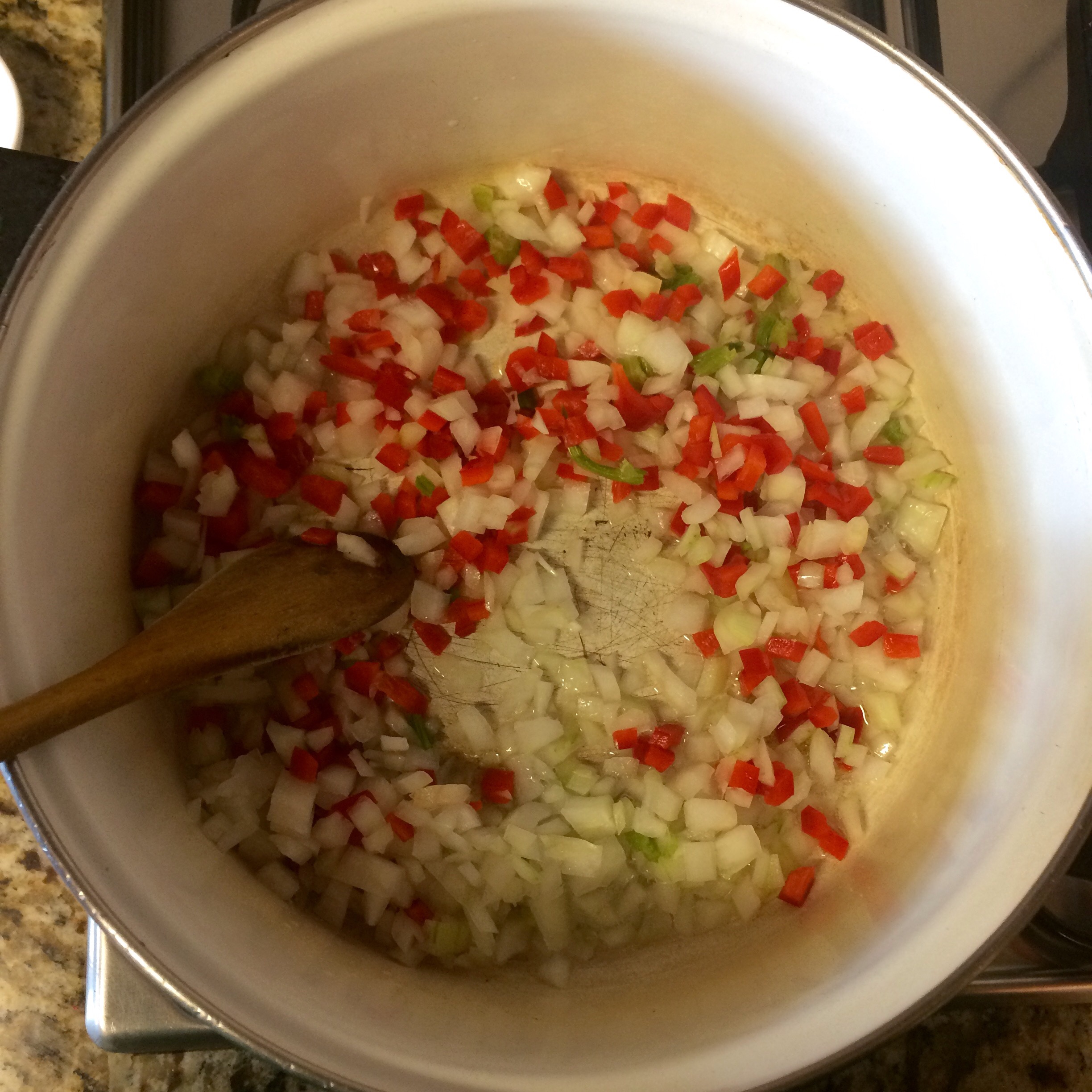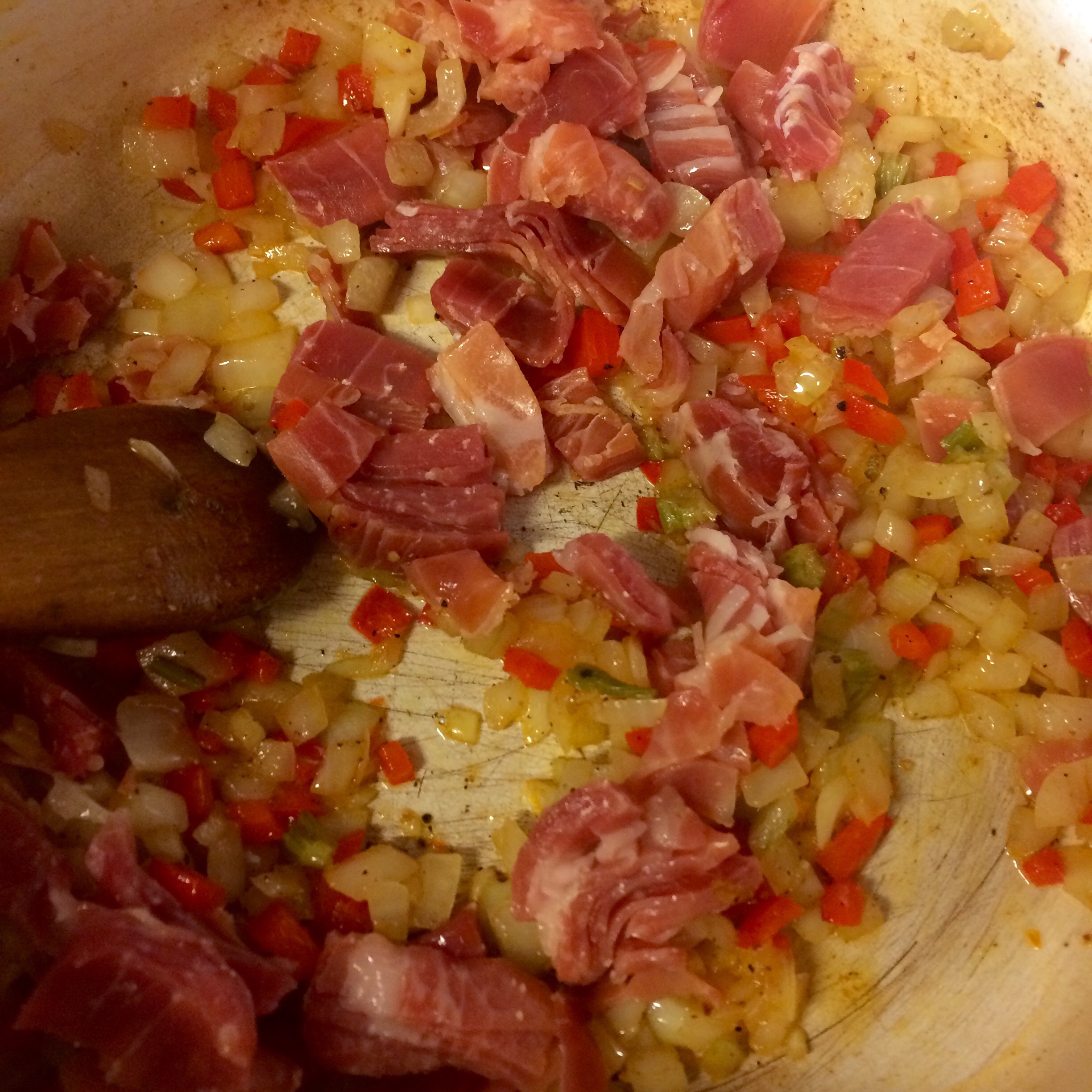 4. En una olla agregamos un poco de aceite y comenzamos blanqueando la cebolla. Cuando la vean transparente agreguen la sal, el pimentón, apio y ajo. Sofrían por 5 minutos. Agregamos los 100 gr de jamón serrano cortado en tiritas. Dejamos freír un par de minutos.