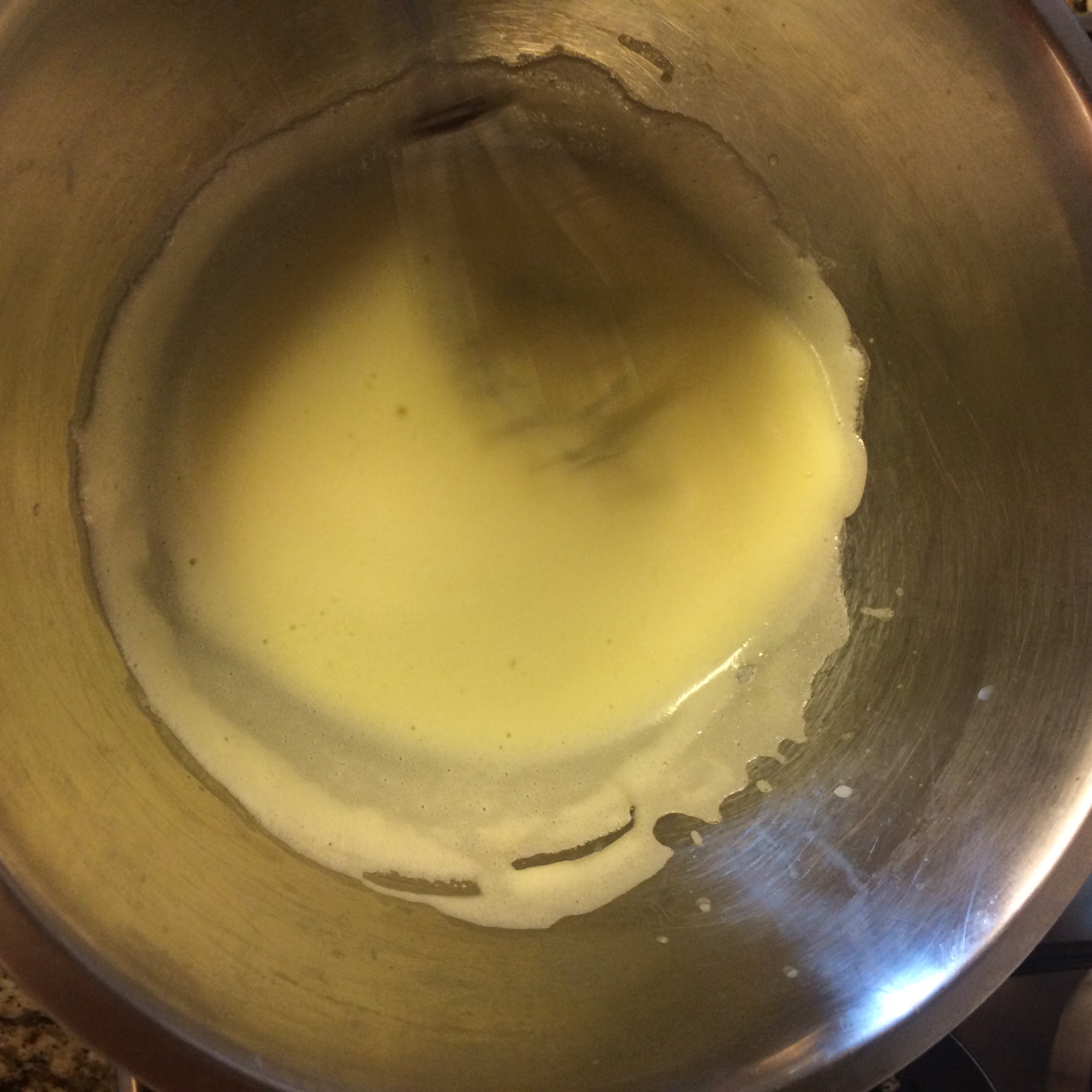 4. Una vez que las yemas empiezan a espesar vamos a agregar la mantequilla derretida en forma de hilo sin parar de batir. Se empezará a formar una salsa espesa amarilla.