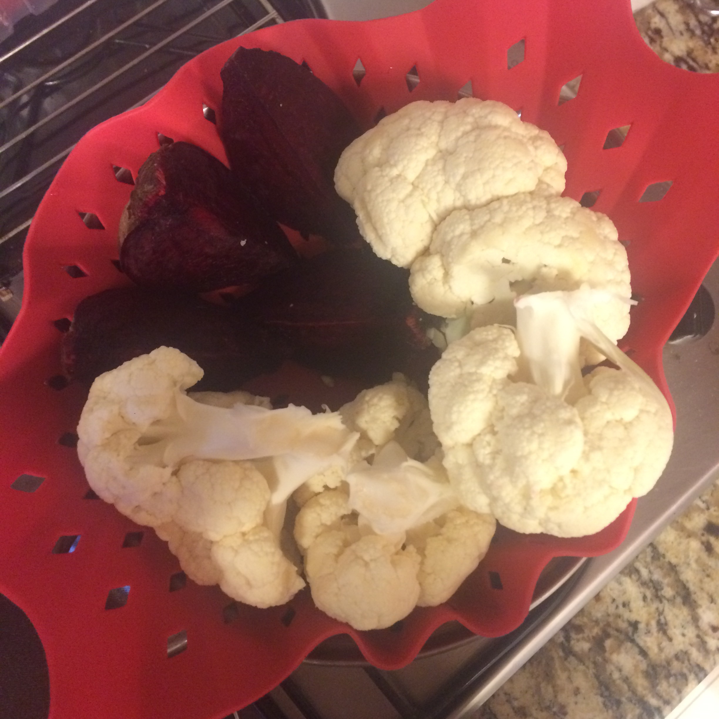 - Vamos a cocinar al vapor las verduras para después hacerlas puré: lavamos la betarraga con cáscara y cortamos en 4. Ponemos en la vaporera junto con la coliflor y dejamos cocinar. Si no tienen vaporera, no se preocupen, cocinen en agua hasta que las verduras estén al dente.