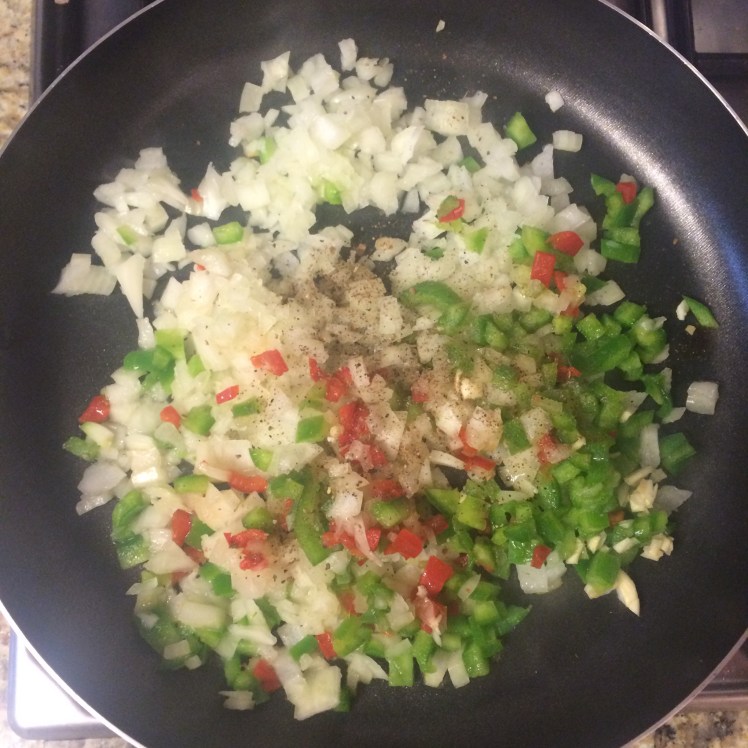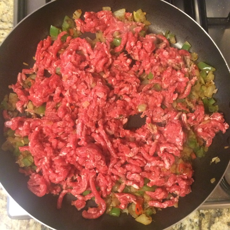 - Mientras se cocinan las verduras vamos a hacer un pino sencillo: pimentón y cebolla en cuadritos. Hacemos un sofrito junto con el ajo. Dejamos cocinar y agregamos la carne molida cuando la cebolla ya haya transparentado. Ponemos en una fuente para horno. Reservamos.
