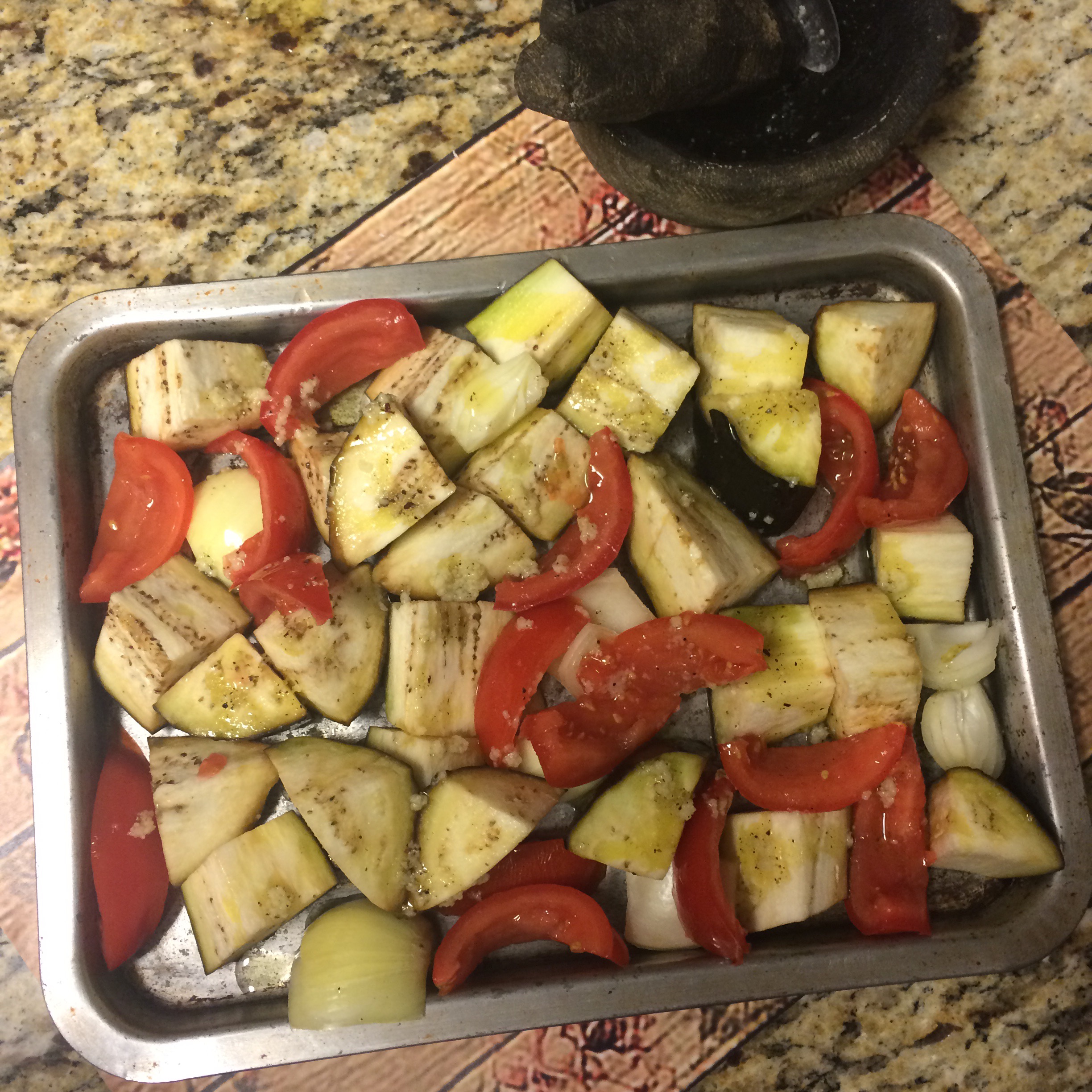 - Ponemos en una bandeja para horno la berenjena, el tomate cortado sin pepas, la cebolla y el ajo