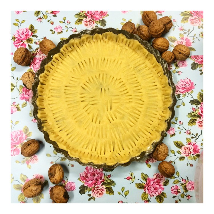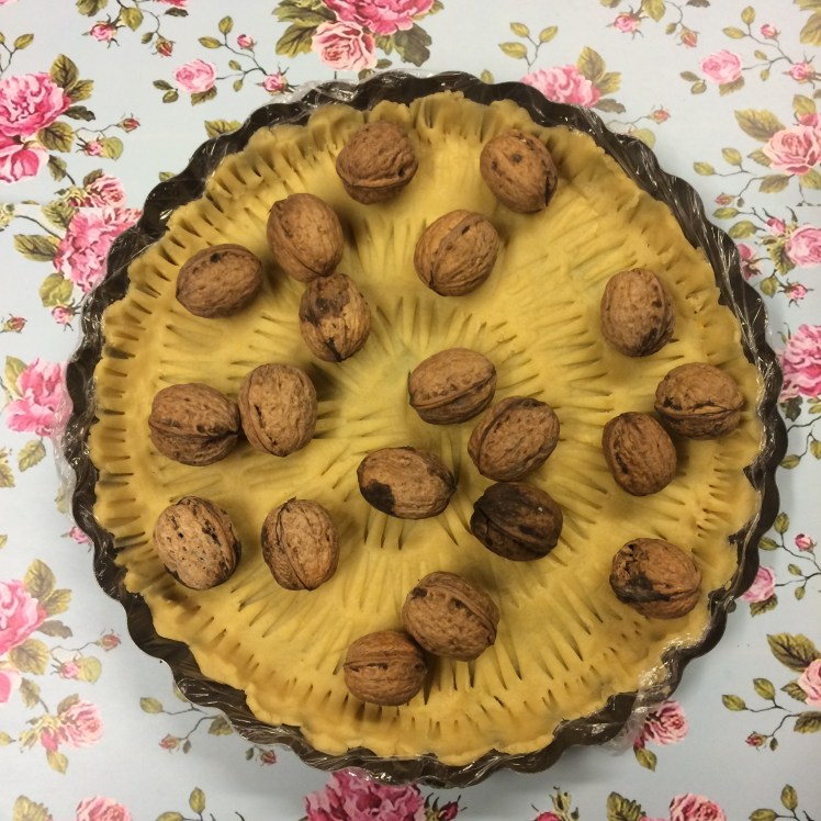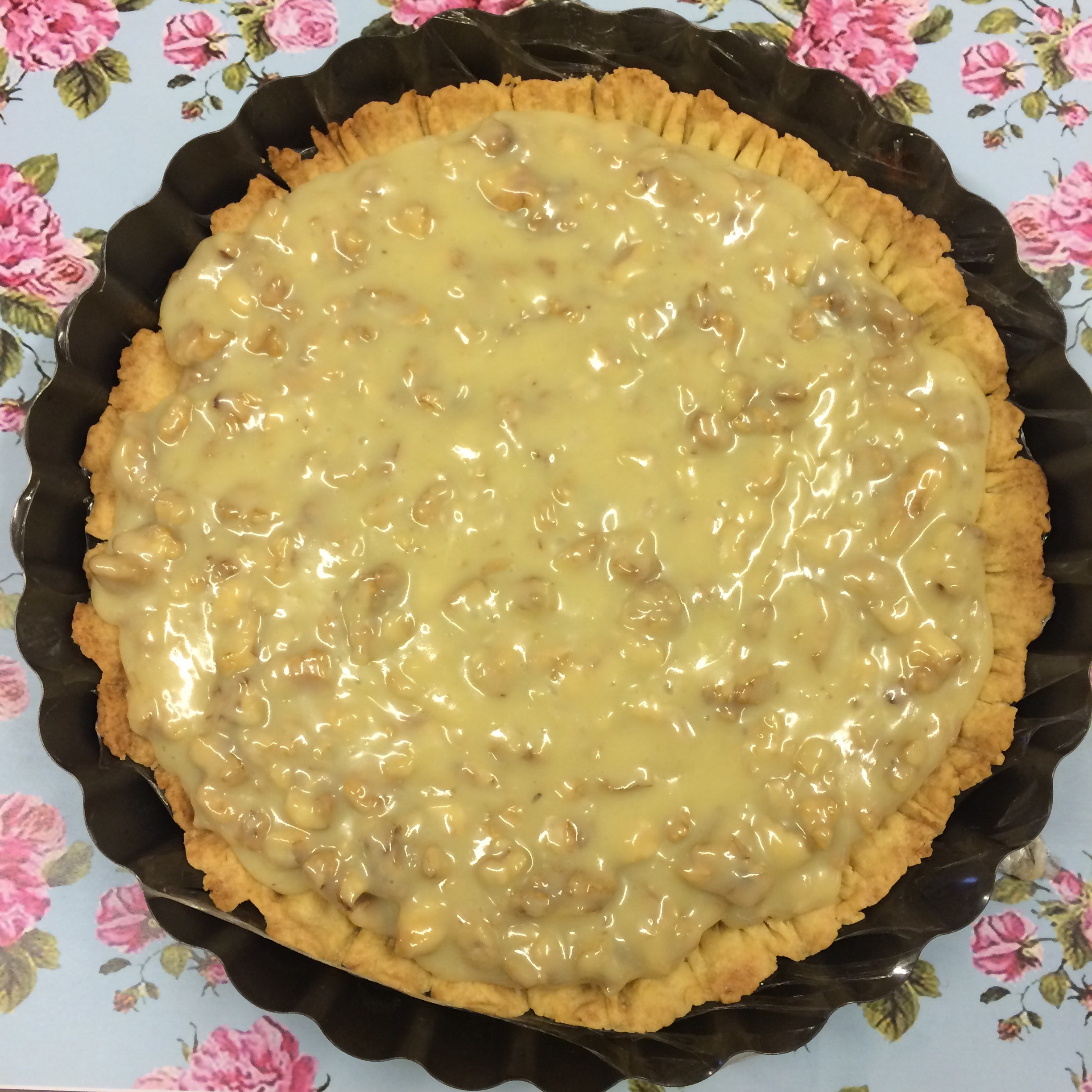 El clásico kuchen de nuez que hacen mi abuela y mi mamá empieza con una masa tipo bizcocho, cortada por la mitad, rellena de crema chantilly y cubierta por este caramelo de nueces. Ese es el kuchen que comí siempre.