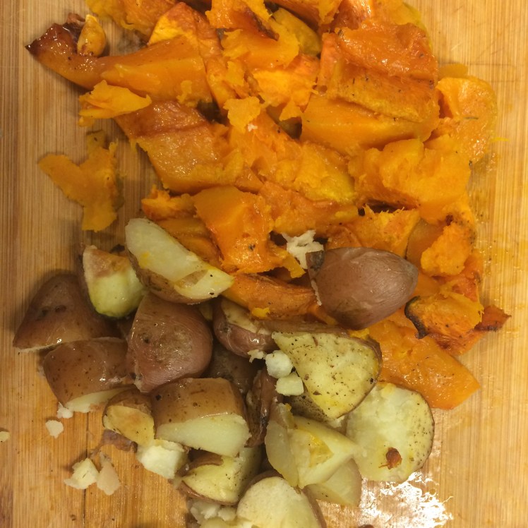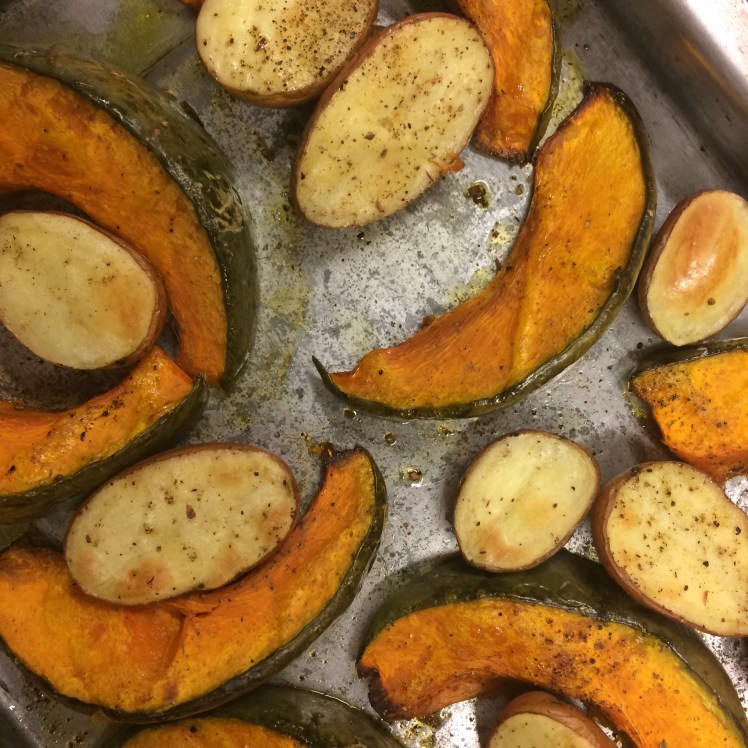 - Cortamos el zapallo y las papas de forma irregular y cocinamos al horno en 200 grados con sal, pimienta, la canela y aceite de oliva por 30-40 minutos.