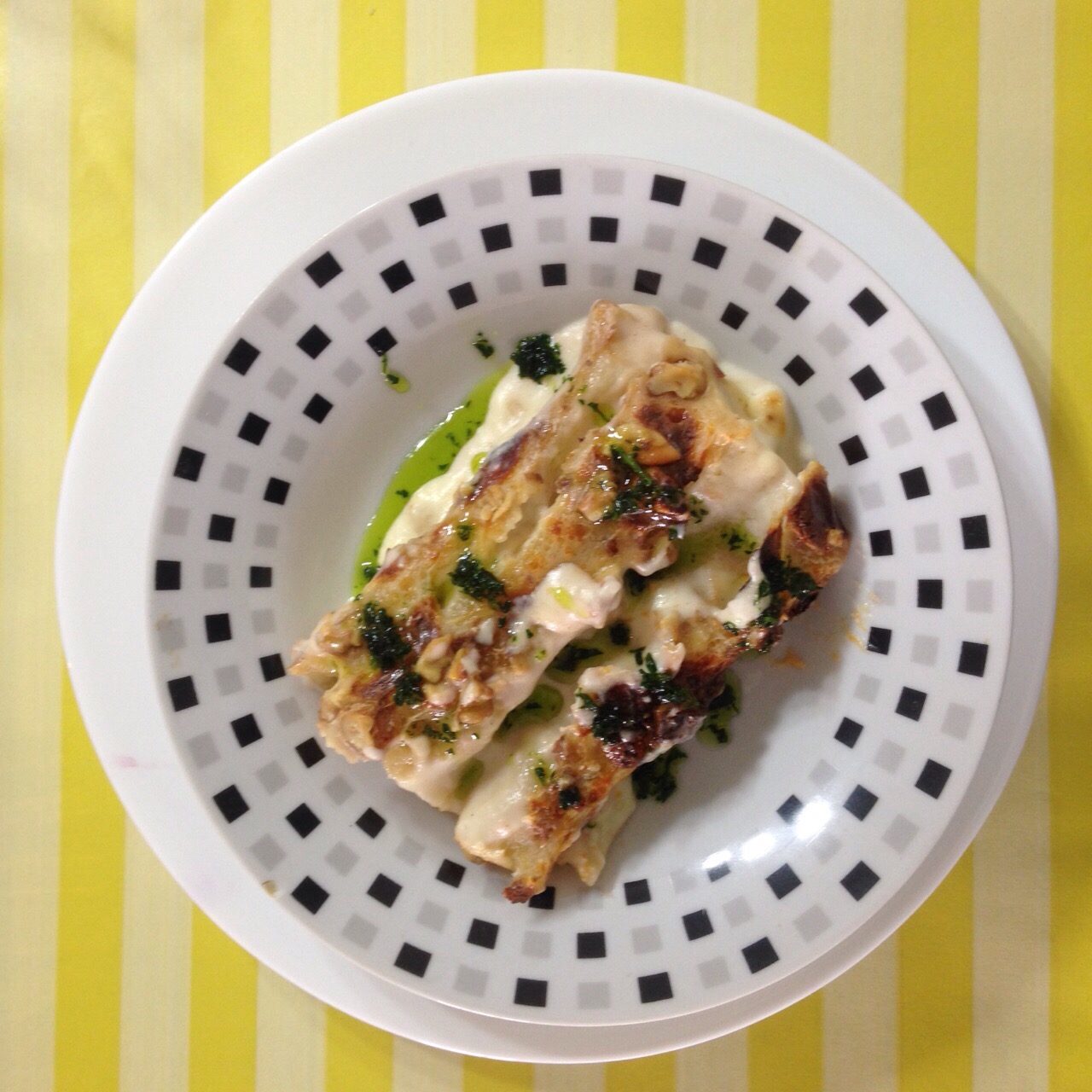 Un puñado de perejil cortado rústicamente, dos cucharadas de mantequilla y un chorro de aceite de oliva. Todo esto cocinar por 5 minutos en un sartén. Poner la mantequilla en la mesa para que cada persona ponga sobre sus canelones. No se van a arrepentir