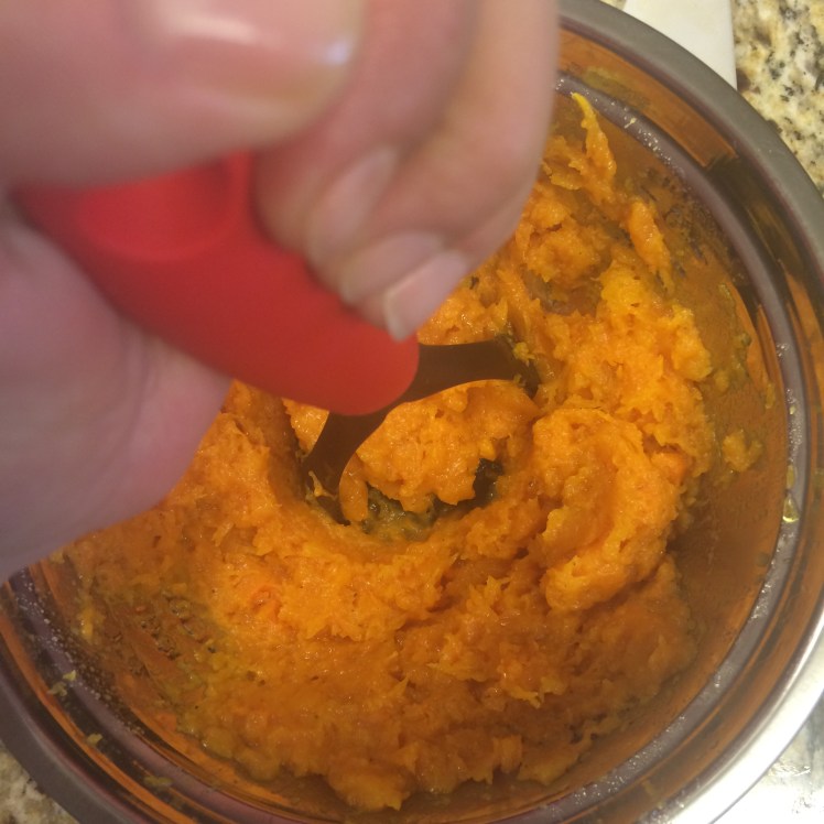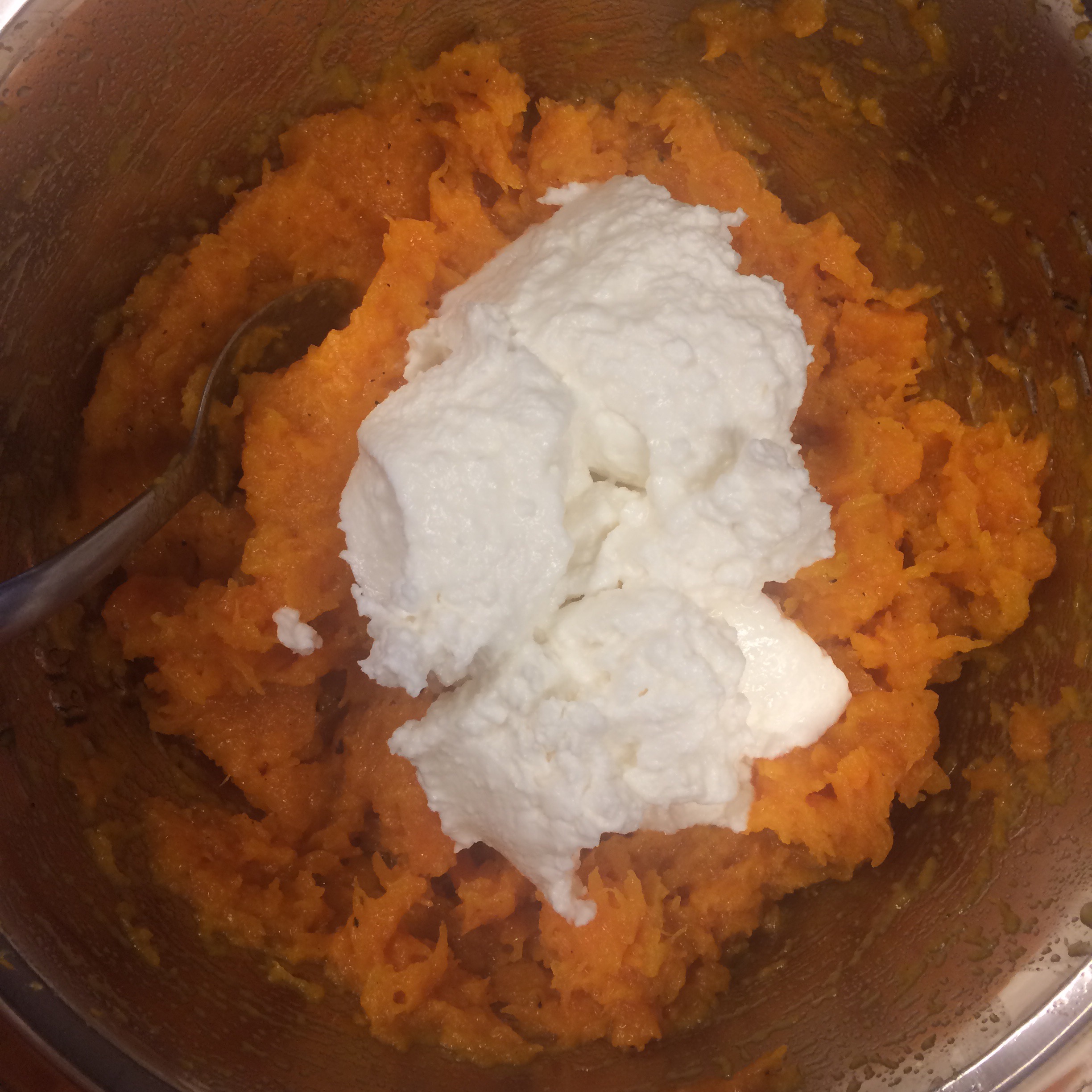 2. Una vez horneado, le sacamos la cáscara y llevamos a un bowl con la ricota y con el pisa papas vamos a formar un puré. Aquí aplicamos la fuerza del brazo para que quede un puré rústico.