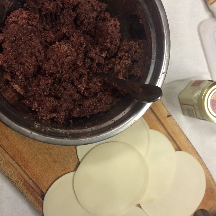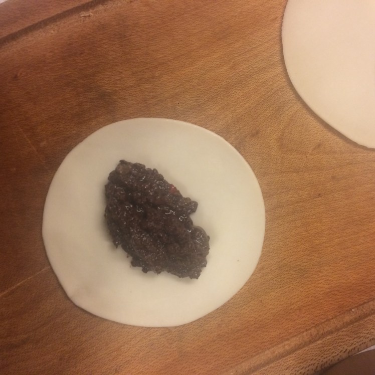 3. Agregamos una cucharada sopera de relleno en el centro y cerramos la masa.