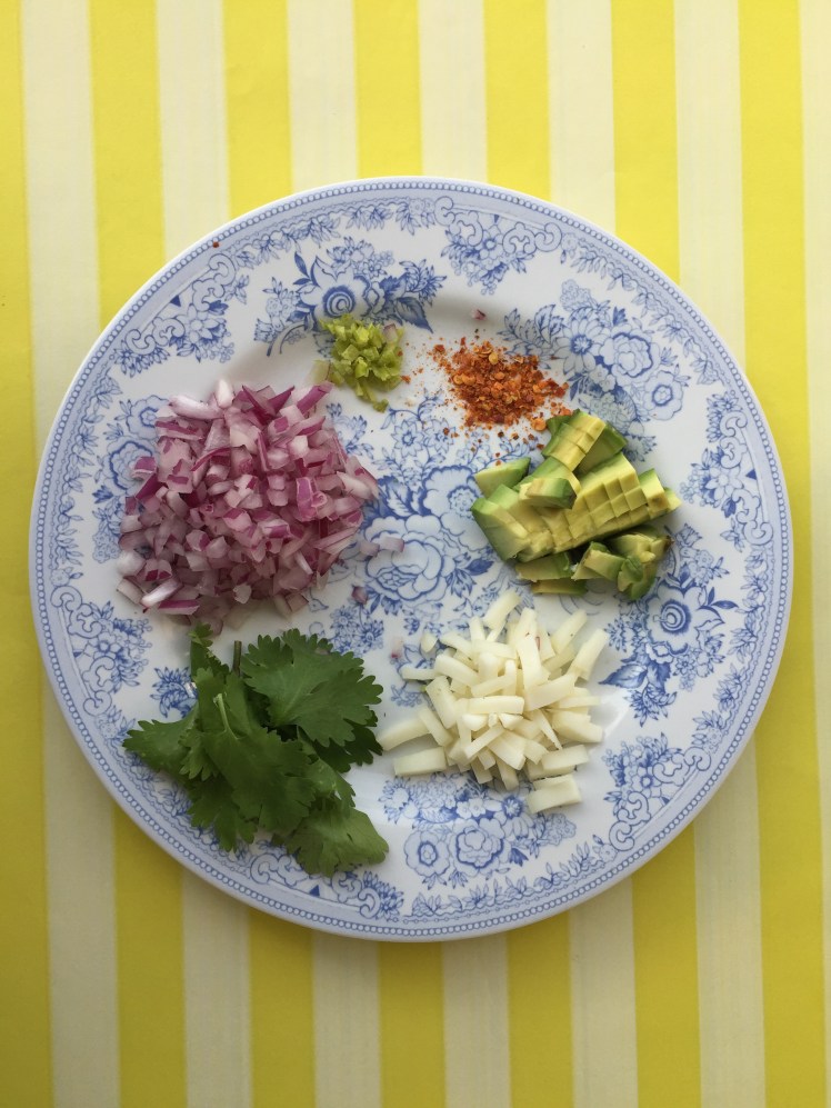 - Picar la cebolla morada, palta y queso de cabra en cuadritos pequeños