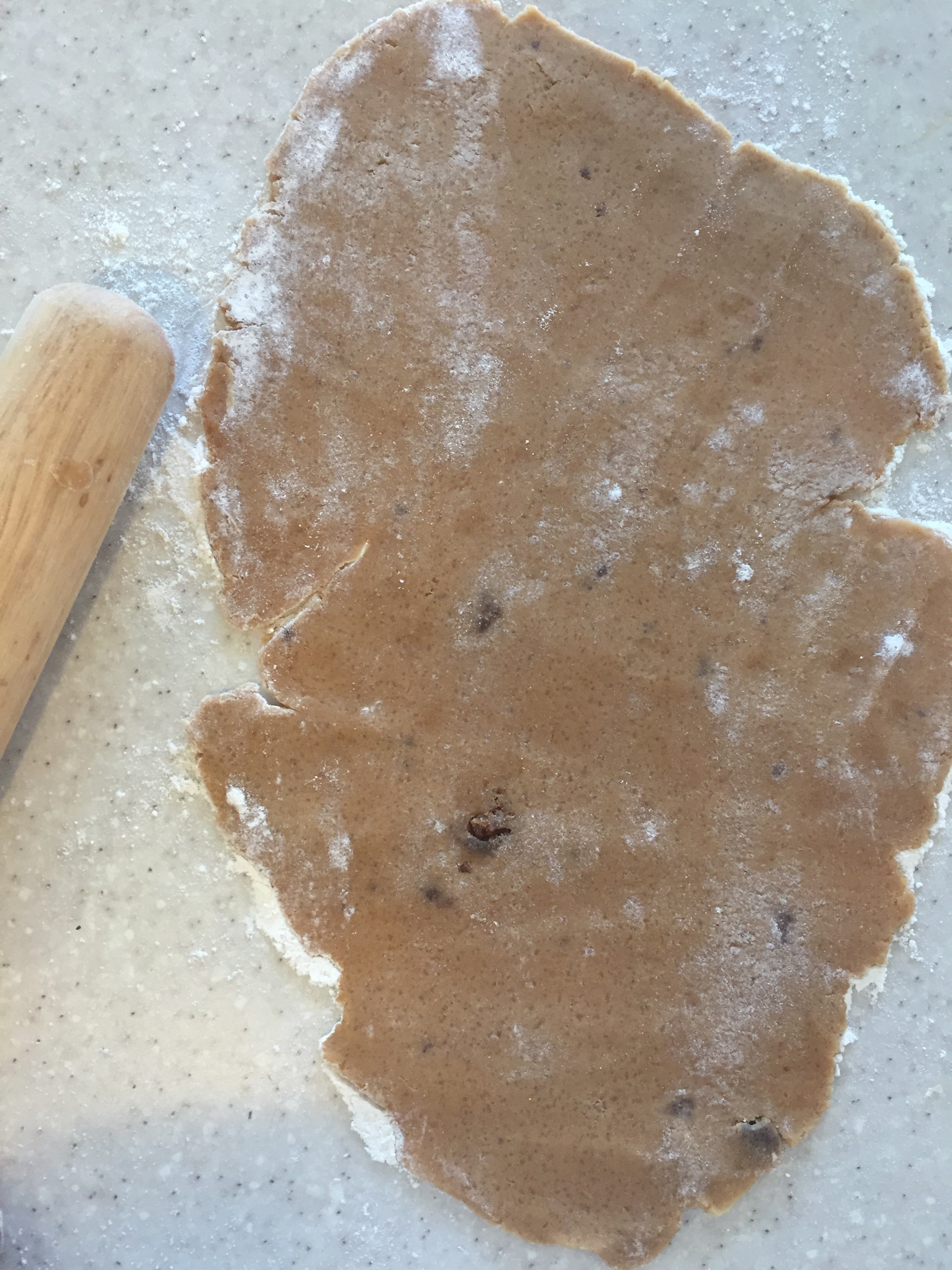 7. Estirar en una mesa con un poco de harina para que no se pegue la masa. Aproximadamente de 2 cm de grosor y cortar con el molde que quieran.